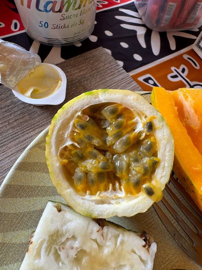 1. It’s a passion fruit! So tasty and sour – they make jam from it here. Delish!